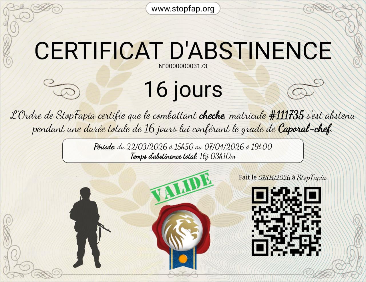 Because if you do nothing your deviances will not disappear they will just be on pauseEdited 14 hours agoNew rank achieved: Caporal-chef - J4 Transformation in progressStarted on 07/04/2026 à 00h00Addiction level: 1 fois par jourNew rank achieved: SoldatGoal set: 30 days